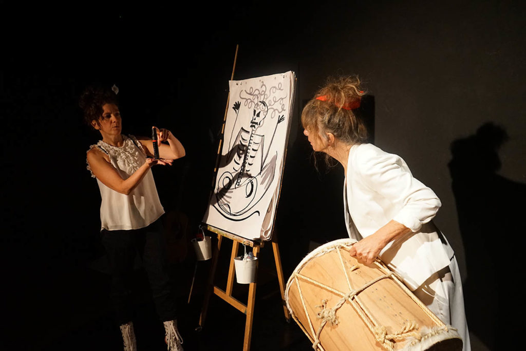 C est la rencontre entre deux femmes qui racontent des histoires, l’une avec ses mots, l’autre avec ses pinceaux. Deux univers fusionnent portés par les battements des cœurs et des tambours. Pour changer de point de vue, des illustrations et des récits singuliers s’animent, avec folie et sagesse, humour et étrangeté.