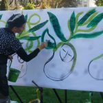 Histoire : La surface est blanche et vierge, une toute petite graine apparait, elle grossit puis devient une pousse, puis une liane qui s’accroche, se tortille, vrille sur toute la surface de la toile, des feuilles de différents vert (vert acide, vert jaune, vert fluo, vert olive, vert profond) recouvrent la surface de la toile. Puis viennent les fleurs, les insectes, et les oiseaux. Accompagnée par un guitariste et/ou un bruiteur, la peintre suit la musique, ou la musique répond aux rythmes du pinceau.