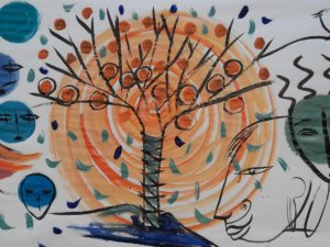 Des histoires de peintres, d’atelier, de création, de couleurs. Il y a parfois de drôles de surprises derrière un trait, au détour d’un dessin. Ce qui est vu, ce qui est entendu, ce qui est dessiné est-ce totalement la réalité ou seulement un reflet du miroir de la vie ? Une fresque de 5 mètres naît en direct sous le regard du public, bercé par le chant intuitif et les contes merveilleux venus de pays lointains.