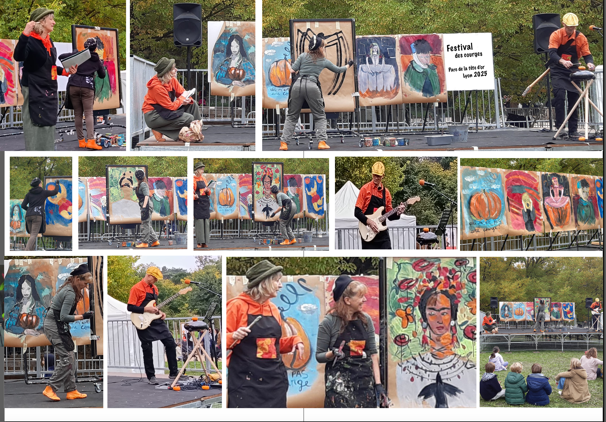 En direct, avec vitalité et rapidité, neuf tableaux célèbres sont reproduits en peinture. Portés par l’énergie des compositions musicales de Xavier Carrez à la guitare et au Hang, la Joconde, le Cri, l’infante naissent en traits évocateurs colorés. Grâce une conférencière loufoque : Elisabeth Granjon, vous apprendrez quelques anecdotes croustillantes et réelles sur ces tableaux. Une note d’humour et de fantaisie sera distillée tout le long du spectacle pour mettre à l’honneur une couleur souvent oubliée dans la peinture dite classique : le orange. La citrouille nous aidera à réhabiliter cette injustice !